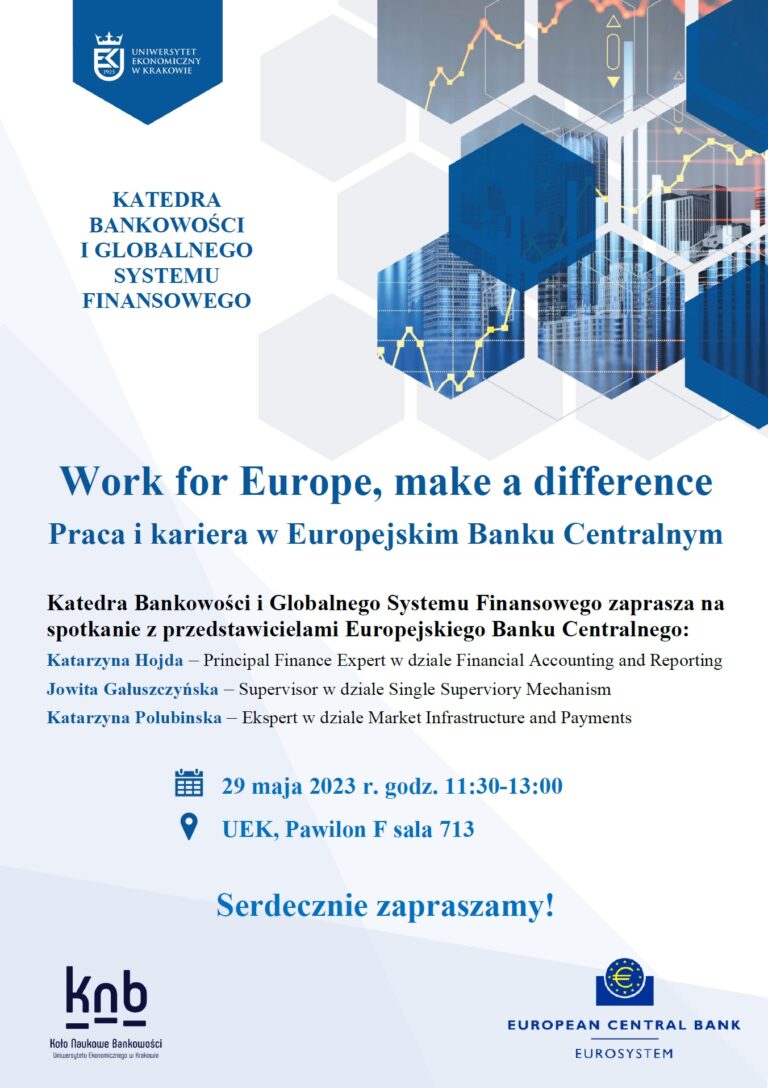 Bardzo serdecznie zapraszamy w dniu 29.05. o godz. 11:30 na organizowany przez Katedrę Bankowości i Globalnego Systemu Finansowego oraz Koło Naukowe Bankowości wykład gościnny przedstawicieli Europejskiego Banku Centralnego, w czasie którego będą Państwo mieli okazję zapoznać się z możliwościami rozpoczęcia kariery zawodowej w Europejskim Banku Centralnym (różne obszary – od polityki monetarnej, przez działalność nadzorczą aż do sprawozdawczości).