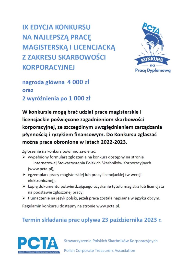 Stowarzyszenie Polskich Skarbników Korporacyjnych organizuje IX edycję Konkursu za najlepszą pracę magisterską i licencjacką z zakresu skarbowości korporacyjnej.