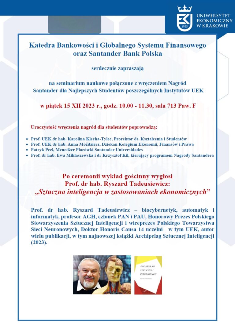 Katedra Bankowości i Globalnego Systemu Finansowego oraz Program Santander Universidades serdecznie zapraszają na seminarium naukowe połączone z wręczeniem nagród dla Najlepszych Studentów poszczególnych Instytutów UEK w ramach Programu Santander Universidades Banku Santander Bank Polska SA, w piątek 15 XII 2023 r., godz. 10.00 – 11.30, sala 713 Paw. F.