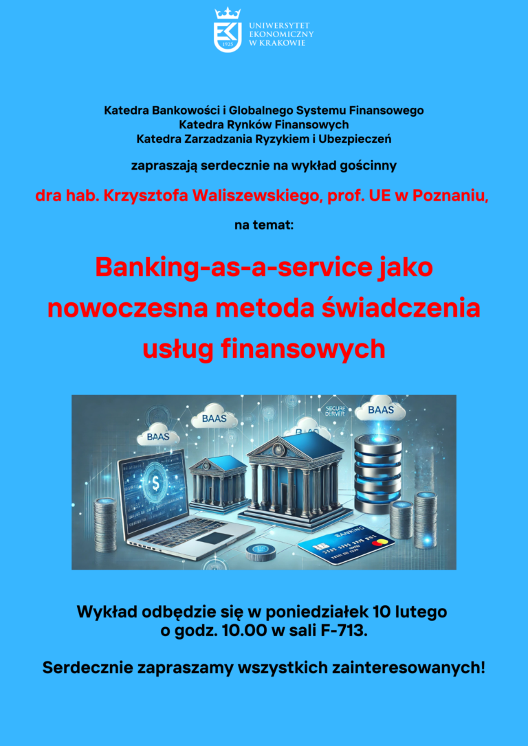 Wykład ekspercki dra hab. Krzysztofa Waliszewskiego, prof. UE w Poznaniu: Banking-as-a-service jako nowoczesna metoda świadczenia usług finansowych 2025-02-06 Poprzedni Program UEK Honours WISE Nowsze Finaliści XV edycji w plebiscycie Mentorzy UEK Zobacz również Interdyscyplinarna Konferencja KN UEK 2025-03-13 „Jak to zrobiłem?” – spotkanie z Prezesem Wiesławem Żyznowskim 2023-05-22 Wykład z cyklu „Jak to zrobiłem?” – Stefan Życzkowski 2024-02-20
