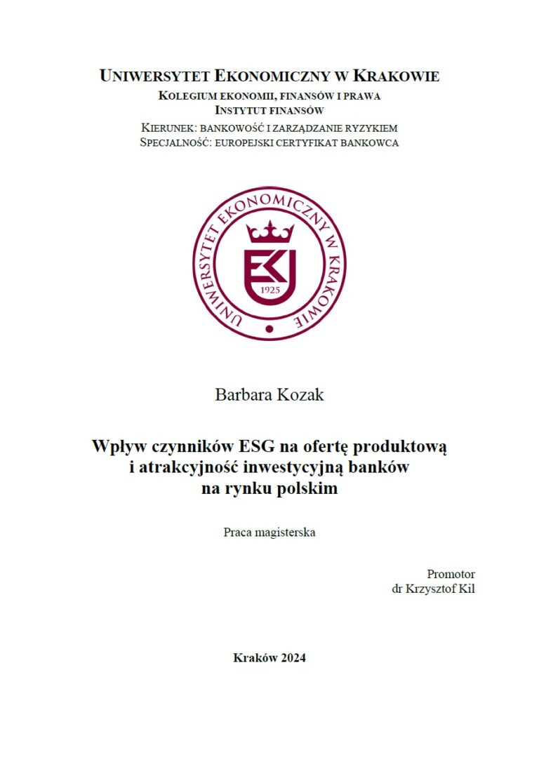 Z przyjemnością informujemy, że w tegorocznej edycji konkursu na najlepszą pracę dyplomową z zakresu finansowych i rachunkowych aspektów zrównoważonego rozwoju organizowanego przez Stowarzyszenie Finansów i Rachunkowości na rzecz Zrównoważonego Rozwoju oraz Wydział Nauk Ekonomicznych i Zarządzania Uniwersytetu Mikołaja Kopernika w Toruniu, wyróżniona została praca magisterska przygotowana przez Panią Barbarę Kozak, Absolwentkę kierunku Bankowość i zarządzanie ryzykiem prowadzonego w Instytucie Finansów, pt. Wpływ czynników ESG na ofertę produktową i atrakcyjność inwestycyjną banków na rynku polskim. Promotorem pracy był dr Krzysztof Kil.