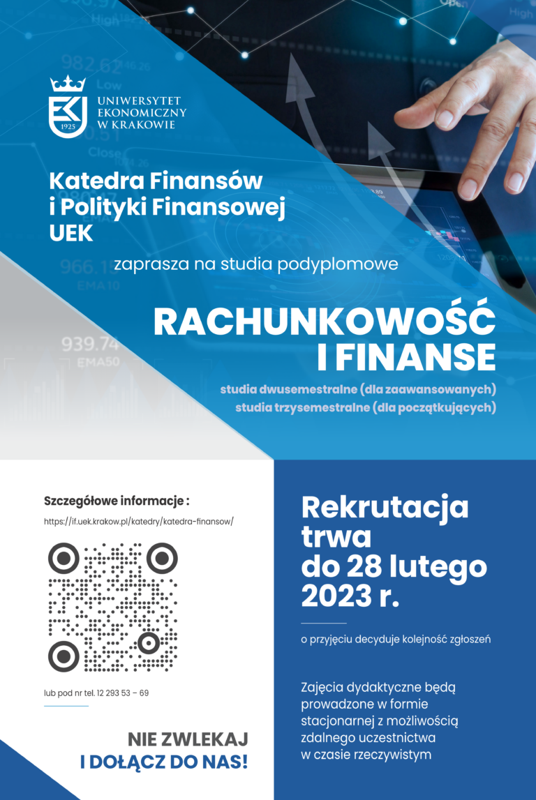Studia podyplomowe Rachunkowość i finanse 2022-12-10 Rekrutacja trwa do 28 lutego 2023 r.Katedra Finansów i Polityki Finansowej zaprasza na studia podyplomowe Rachunkowość i finanse Poprzedni Uroczyste zakończenie studiów podyplomowych realizowanych dla pracowników resortu finansów Nowsze Zaproszenie – konkurs Ministerstwa Finansów – Podatkowi Liderzy, 12. edycja