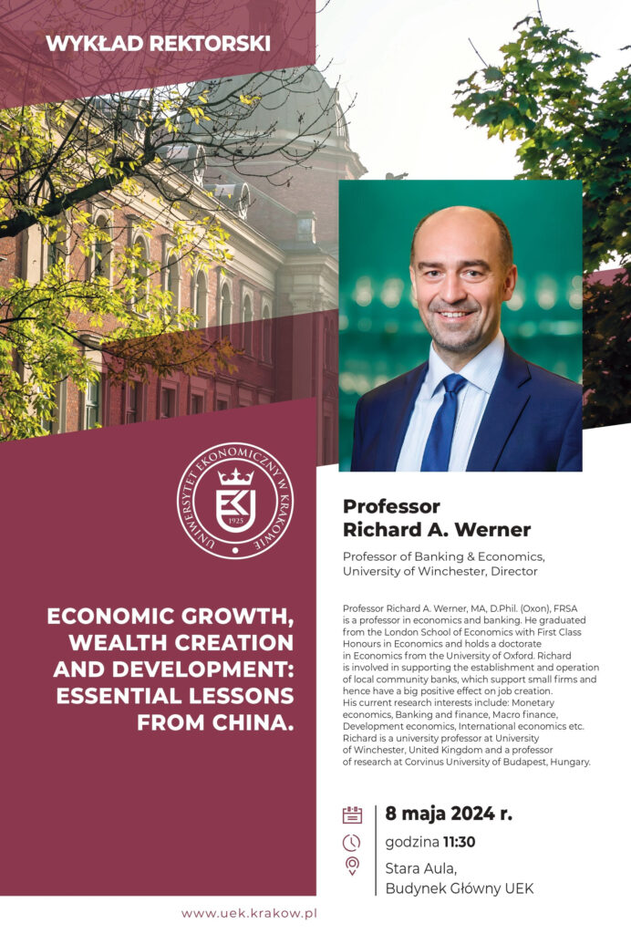 Serdecznie zapraszamy na Wykład Rektorski pt. “Economic Growth, Wealth Creation and Development: Essential Lessons from China”, który w środę 8 maja 2024 r. wygłosi prof. Richard A. Werner, Profesor Zwyczajny w Dziedzinie Ekonomii, stopień doktorski uzyskany na Uniwersytecie Oxfordzkim.