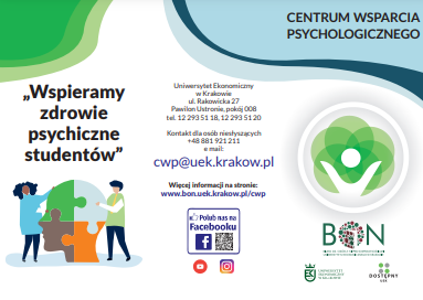 2. Centrum Wsparcia Psychologicznego UEK – wsparcie Psychologiczne na UEK dla każdego studenta, doktoranta, słuchacza studiów podyplomowych oraz pracowników UEK – lecz w sprawach dot. studentów.