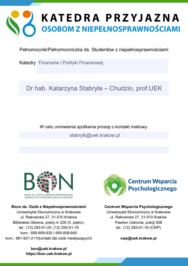 Nazywam się Katarzyna Stabryła-Chudzio.Jestem pełnomocnikiem ds. osób z niepełnosprawnościami w Katedrze Finansów i Polityki Finansowej. Pełniąc tę funkcję współpracuję z Biurem ds. Osób z Niepełnosprawnościami na rzecz zwiększania dostępności Katedry dla osób z niepełnosprawnościami.