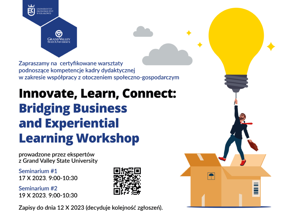 Mamy przyjemność zaprosić Państwa na certyfikowane warsztaty pt. „Innovate, Learn, Connect: Bridging Business and Experiential Learning Workshop”, które odbędą się w dniach 17 i 19 października na naszej Uczelni. Warsztaty będą prowadzone przez pracowników Grand Valley State University z USA.